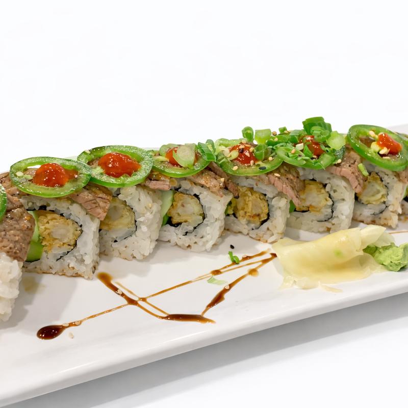 Tempura shrimp, asparagus, cucumber, topped with beef tataki, sliced jalapeños, scallion