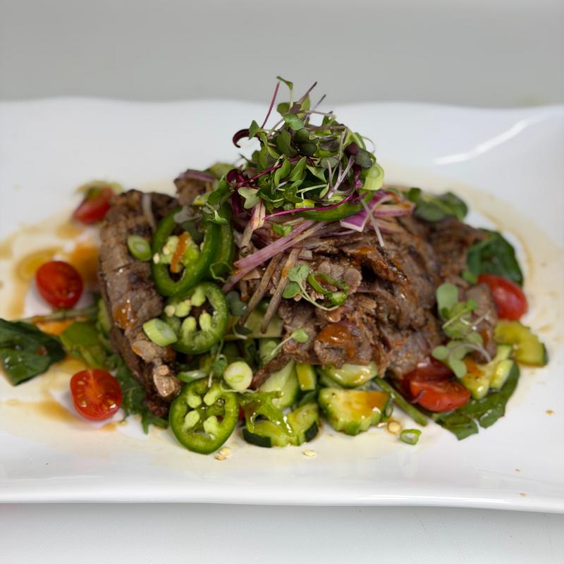 Juicy grilled beef tossed with fresh lime juice, chili, red onion, tomatoes, and Thai herbs in a bold spicy-tangy dressing. Served over fresh greens