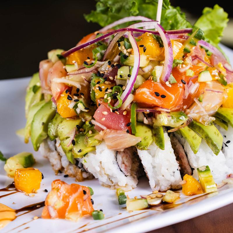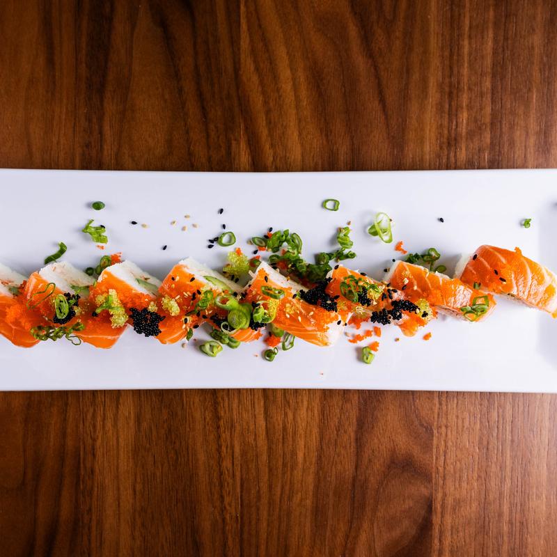 Tuna, salmon, avocado, cucumber, topped with tuna tataki, spicy salmon, habanero fish eggs, jalapeño fish eggs, spicy mayo and eel sauce