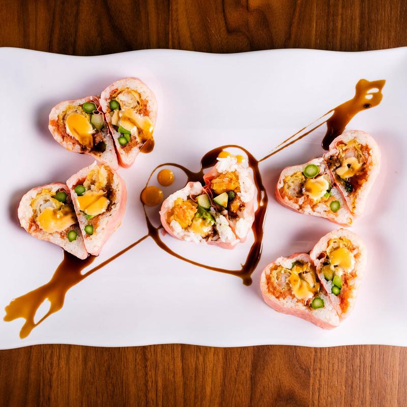 Tempura shrimp, tuna tataki, avocado, topped with spicy tuna, mango, sweet chili sauce and eel sauce