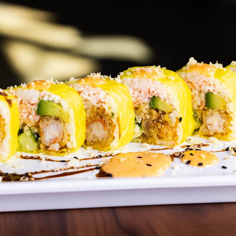 Deep fried roll, snow crab, white fish, asparagus, fish eggs, topped with spicy mayo and eel sauce
