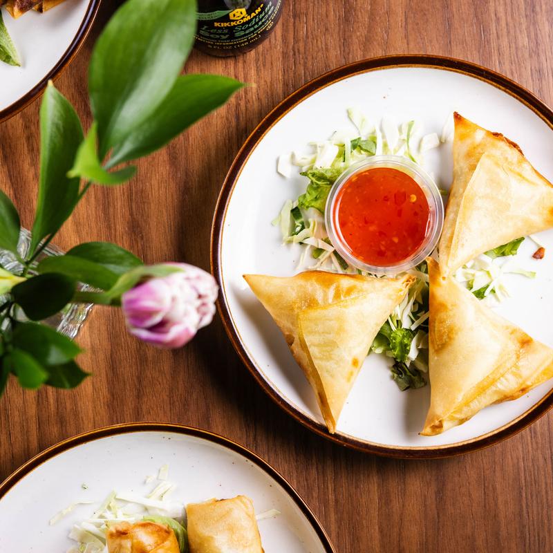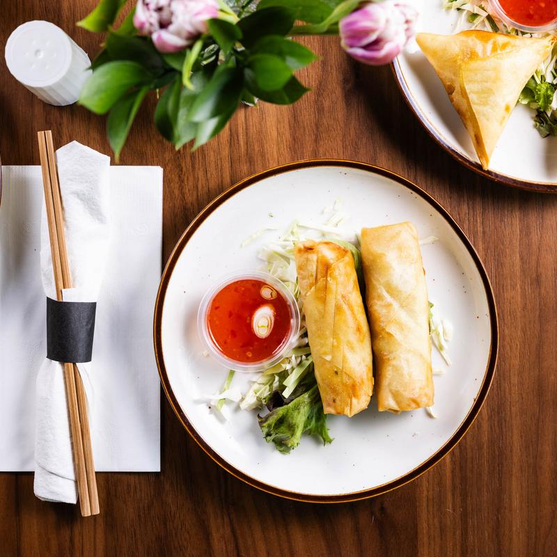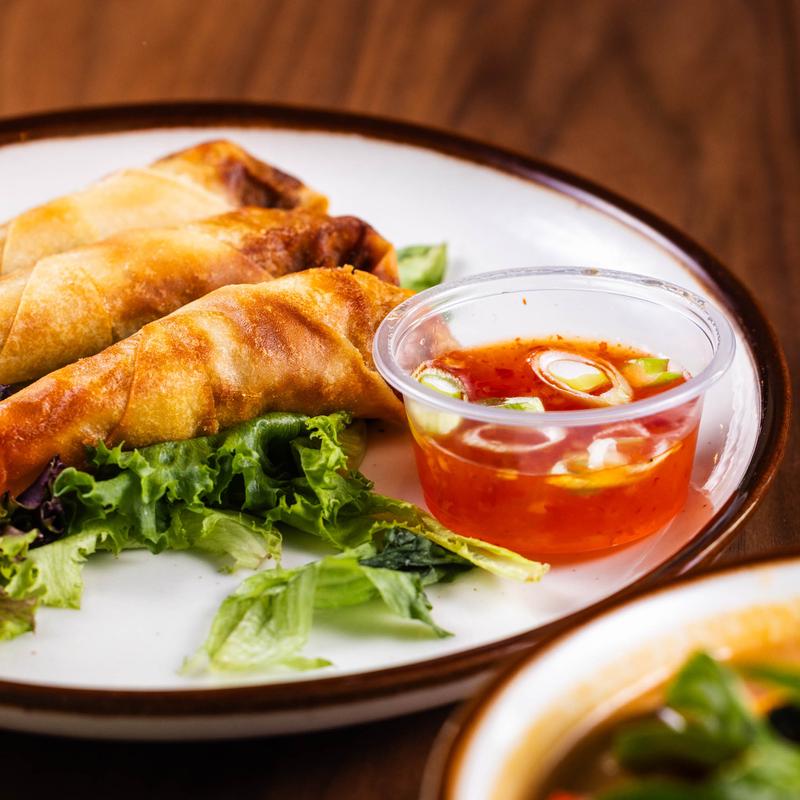 Hand-rolled spring rolls stuffed with glass noodles and vegetables. Fried until golden brown and served with sweet chili dipping sauce
