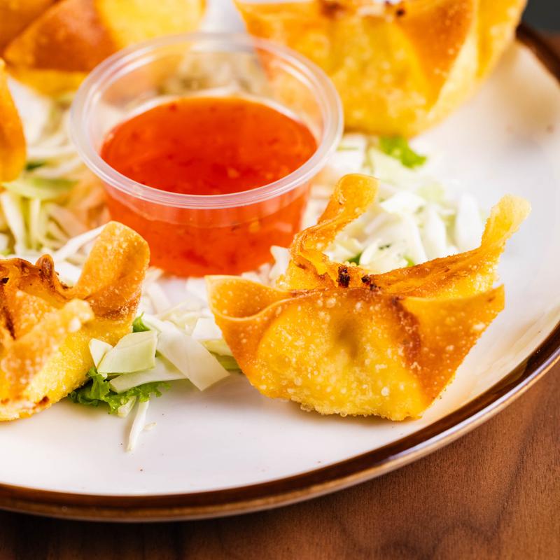 Crispy wontons filled with cream cheese, crab meat, and Thai herbs. Served with sweet chili sauce